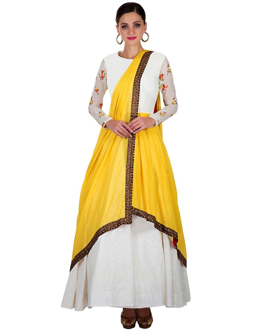 Embroidery Dress Patterns G3 Fs Off White Cotton Silk Gown With Yellow Marble Pattern Drape