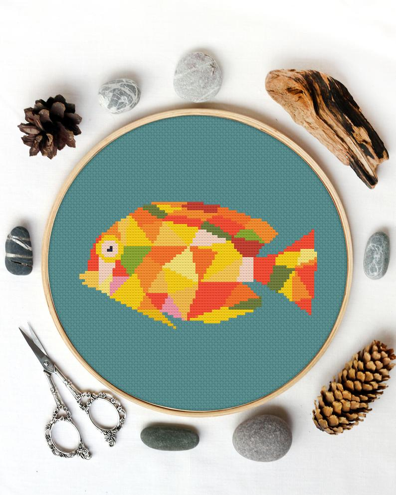 Fish Embroidery Patterns Geometric Yellow Fish Cross Stitch Embroidery Pattern Modern Sea Tropical Stitching How To Cross Stitch Counted Cross Stitch Stitch Patterns