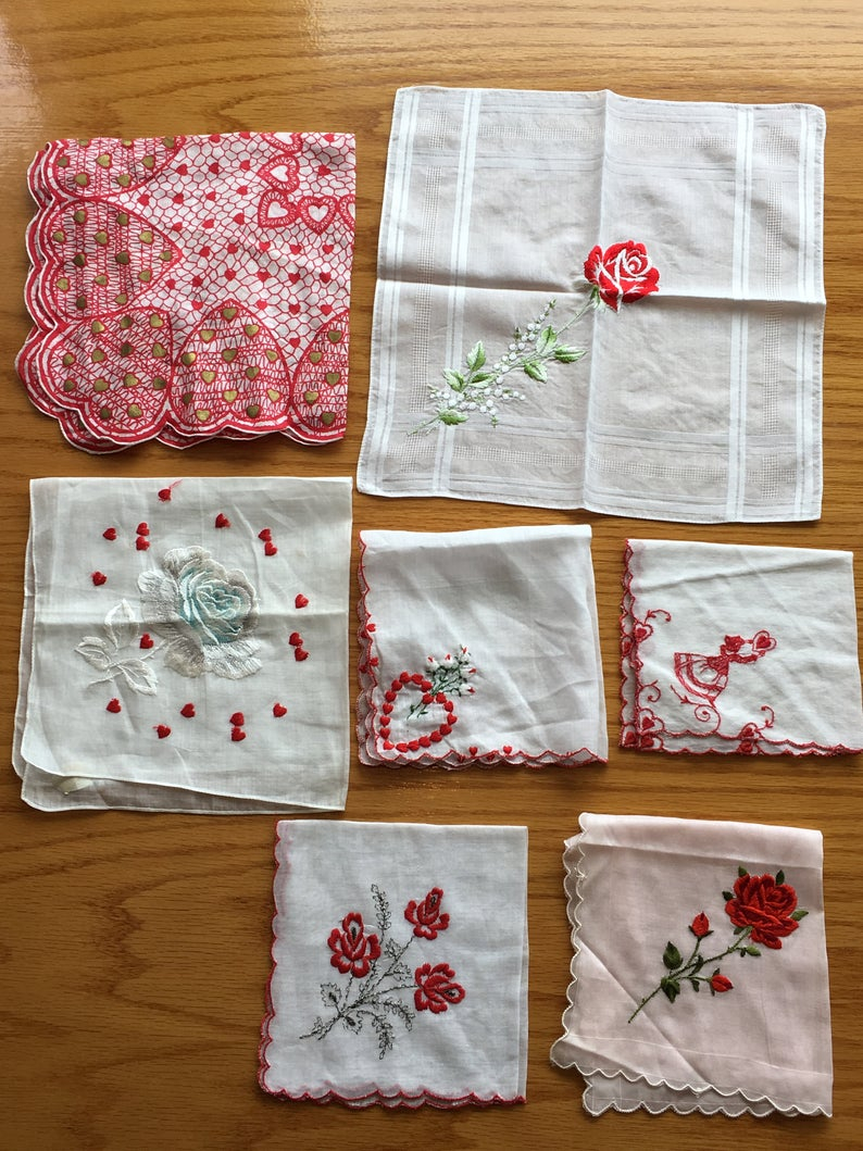 Handkerchief Embroidery Patterns Vintage Lot Of 7 Valentines Day Lovers Handkerchief With Red Roses And Red Hearts Valentines Day Handkerchief Red Heart Hanky Red Rose