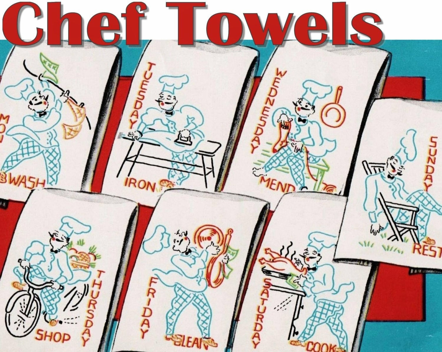 Kitchen Towel Embroidery Patterns Chef Towels Vintage Kitchen Towel Embroidery Pattern Vogart 654 Pdf Instant Download Day Of The Week Towels Vintage Tea Towel Embroidery