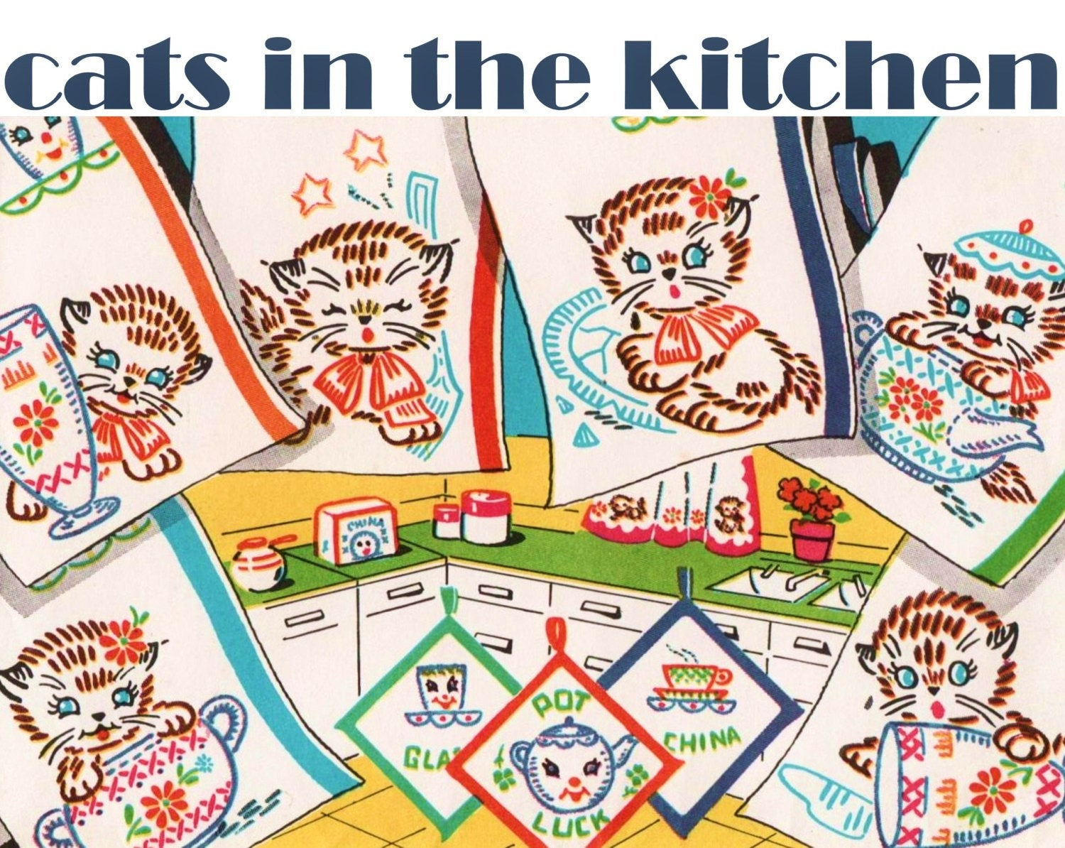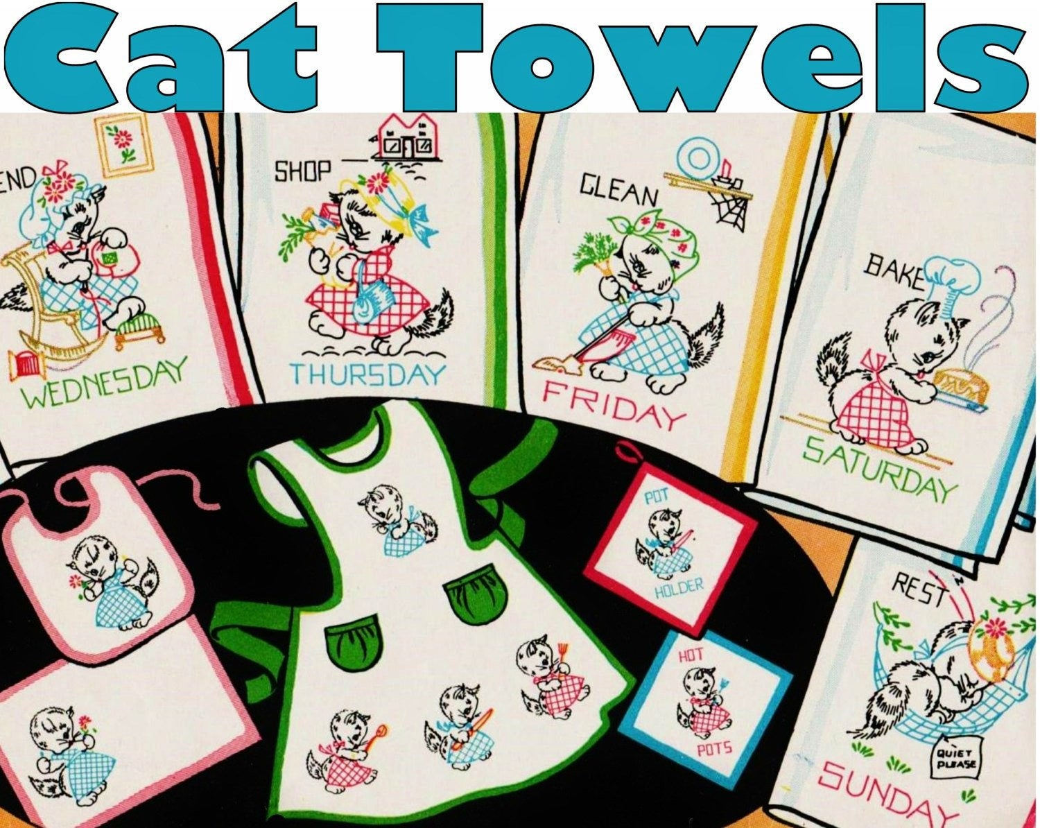 Kitchen Towel Embroidery Patterns Cat Tea Towels Day Of The Week Towel Embroidery Pattern Pdf Download Flour Sack Towels Vintage Kitchen Towels Cat Towels Vintage Dish Towels