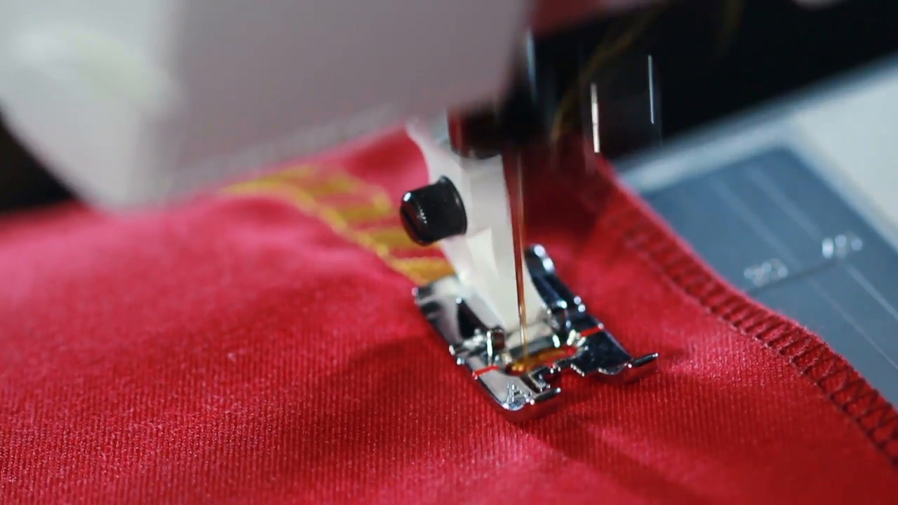 Sewing Machine Embroidery Patterns Embroidery Machine Sewing Machine Embroider Pattern On The Fabric Sewing Needle Stitching Seam On Fabric In Slow Motion Yellow Thread Pattern On Red Fabric Sewing Machine Slow Motion